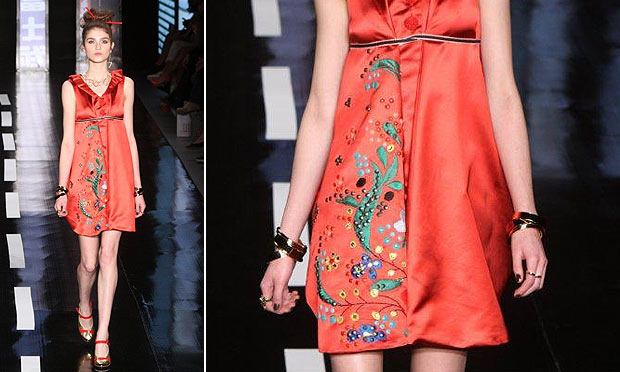 Bordado delicado aparece no vestido vermelho da grife Oh Boy