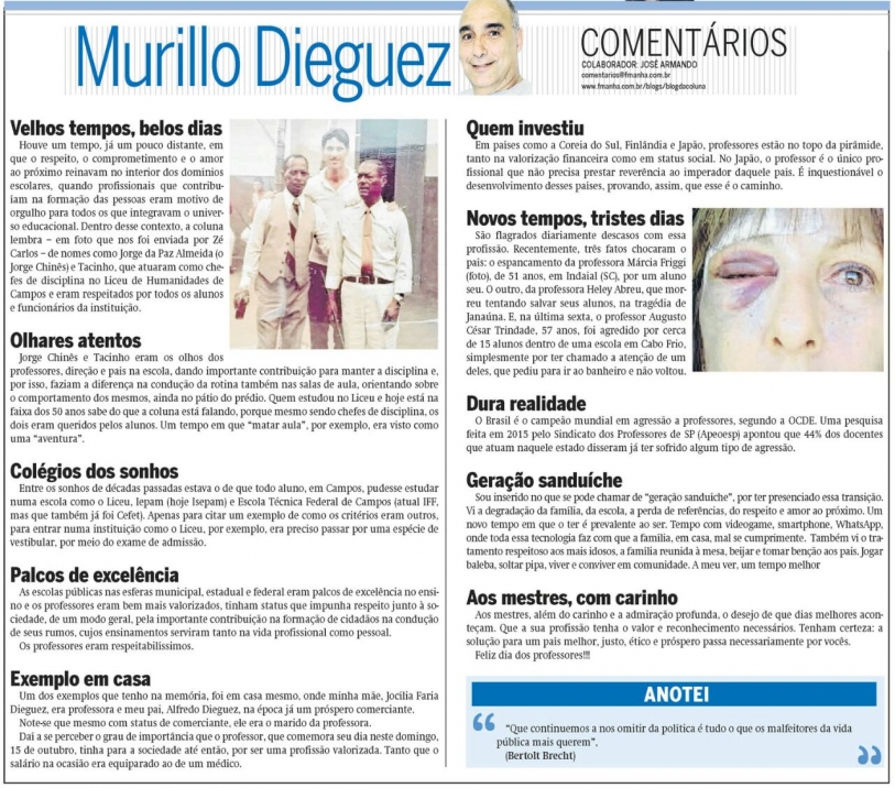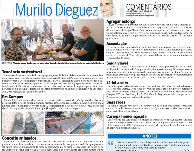 As imagens da calha totalmente assoreada do Rio Paraíba do Sul e Rio Itabapoana, dos Rios, Preto, Urubú, Imbé e Ururaí, dos leito secos dos riachos e canais tributários, do solo ressequido, no “fundo” de grandes lagoas como da Saudade e São Gregório, do 'restojo' de lama na ex gigante Lagoa de Campelo, apavoram a nossa mente e esmagam a visão passada de fartura e pujança da pesca. São só uns poucos exemplos , do inferno que se anuncia. E; só uma ‘lógica’ a ser seguida: “ Não se pode voltar atrás e fazer um novo começo, mas parar agora e agir, na construção de um futuro diferente”. É o perfeito mestre Chico Xavier.