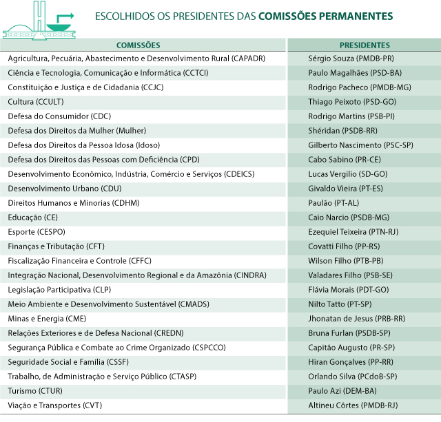 Foram eleitos nesta quinta-feira (23) os presidentes que dirigirão neste ano o trabalho das 25 comissões permanentes da Câmara dos Deputados. Os nomes foram indicados pelos partidos e ratificados nos colegiados. A eleição dos vice-presidentes (1º, 2º e 3º) será feita posteriormente.