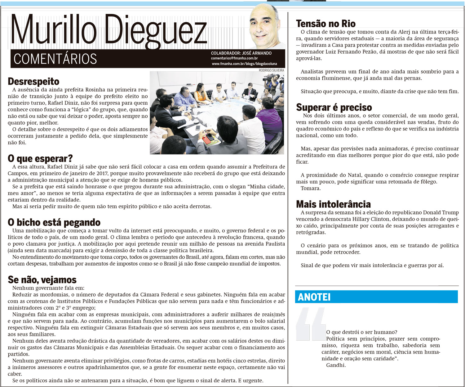 Convidado a sair da emissora Direto do Studio: também fresquinha a informação de que hoje pela manhã, o apresentador de um dos programas da rádio, e um dos mais fiéis seguidores do Garotinho foi convidado a sair da emissora, pelo dono[formalizado] da rádio Diário. Caiu o Diretor Também de fonte segura, a informação de que o braço forte do grupo rosáceo na rádio Diário, já é um ex diretor. Caiu, e o novo já assumiu ! RupturaAnuncia-se de maneiras tortas pelas mídias sociais o fim de uma longa amizade, e profícua parceria comercial. Parece que, se comprovado, assim com a autoria do áudio, este seria também o fim de um longo período de submissão aos interesses unos do grupo do Garotinho.Sem dúvida , o maior canal de sustentação da midiática política eleitoral do ' moço da Lapa'.