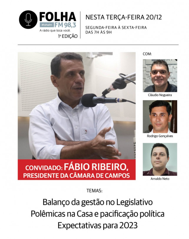 O Folha no Ar desta terça-feira (20), a partir das 7h, recebe o atual presidente da Câmara de Campos, Fábio Ribeiro (PSD). Ele faz um balanço sobre os dois anos à frente do Legislativo, as polêmicas que rondaram a Casa neste período, o clima de pacificação política na cidade, perspectivas para 2023, entre outros assuntos. O programa também marca a estreia do jornalista Rodrigo Gonçalves na bancada do Folha no Ar.