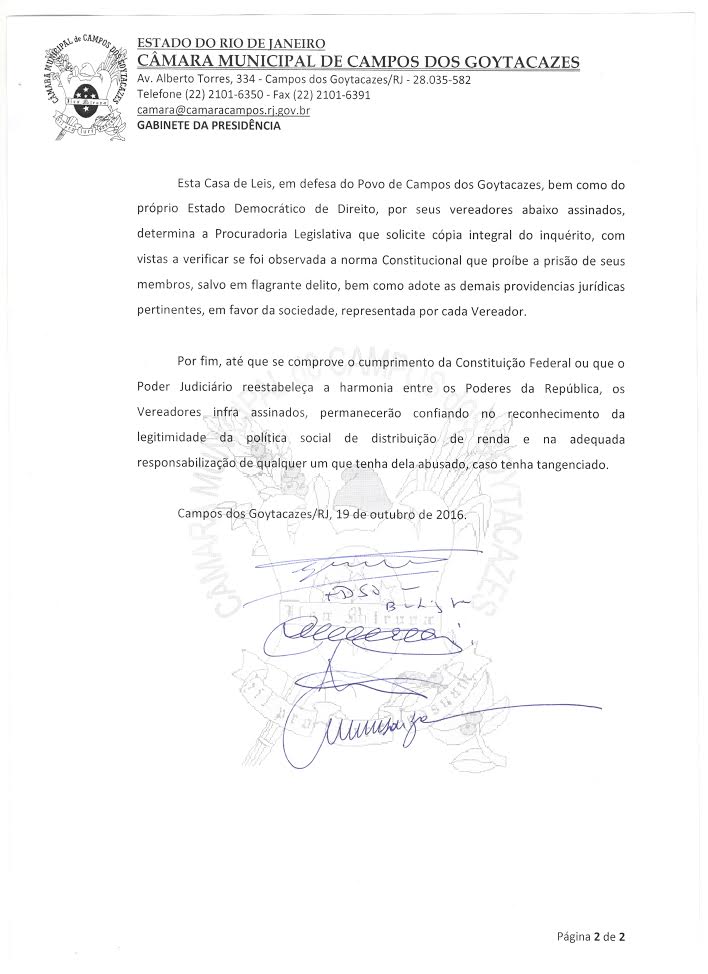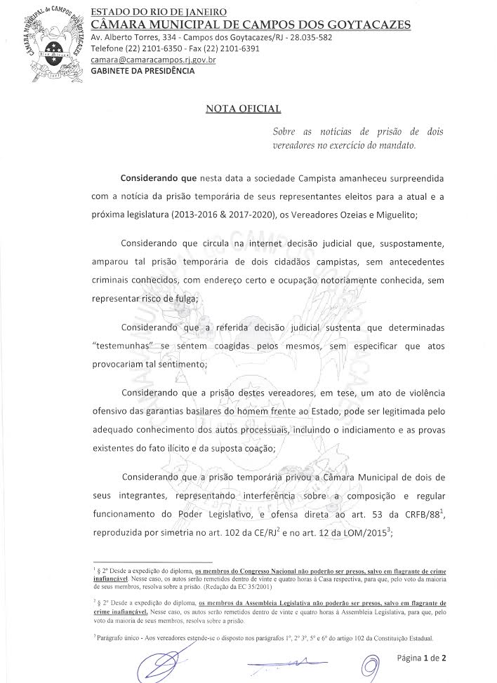 O vereador Miguelito não parecia muito preocupado com a prisão. Ontem, ao ser flagrado por cinegrafistas na garagem da delegacia da Polícia Federal, o parlamentar rosáceo bateu no peito, sorriu e fez um sinal positivo. Talvez ele confie na Câmara, que colocou sua tropa jurídica para dar auxílio. Ou seja, essa defesa será bancada pela população de Campos.