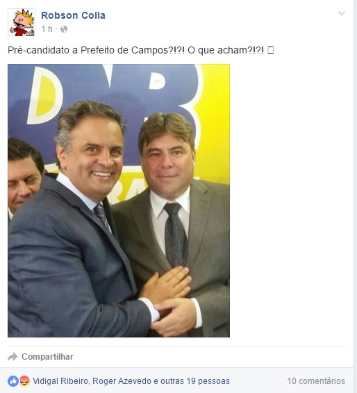 Mas pelo jeito o PSDB já tem um plano B, caso Mauro deixe a disputa, O empresário Robson Colla, presidente do partido em Campos, postou no Facebook uma foto ao lado do senador Aécio Neves, presidente nacional do PSDB, e deixou a seguinte pergunta no ar: "Pré-candidato a Prefeito de Campos?!?! O que acham?!?!".