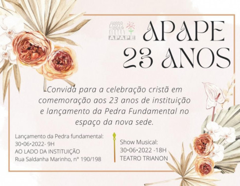 Os 23 anos de fundação Associação de Pais de Pessoas Especiais do Norte e Noroeste do Rio de Janeiro (Apape) serão comemorados com uma programação especial no próximo dia 30, em Campos. Quando estivemos visitando recentemente a instituição, a presidente Naira Peçanha já tinha nos adiantado com seria parte da programação, que agora agente traz completa para vocês aqui no nosso blog.