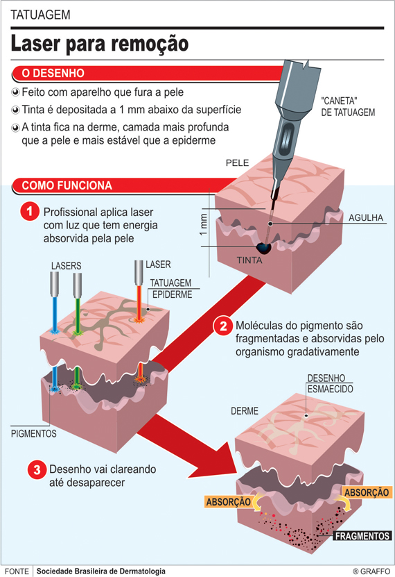 A tinta de uma tatuagem é colocada na derme, camada mais profunda que a pele e mais estável que a epiderme, a cerda de 3 mm de profundidade. Já a remoção do desenho é feita através da fragmentação das moléculas pela energia absorvida por meio do laser, o que também dói bastante. Além de doer na pele, ambos os procedimentos (tatuagem e remoção) doem no bolso, pois podem custar muito caro.