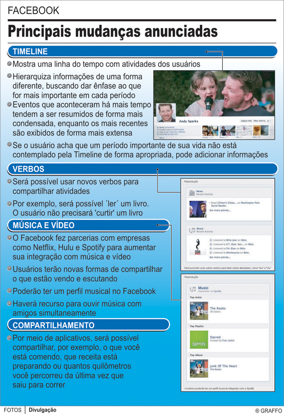 Ainda na conferência, transmitida pela internet, Zuckerberg destacou o Spotify, uma plataforma de reprodução de música em nuvem, ou seja, sem a necessidade de baixar os arquivos no computador. Através das novas funções, os usuários de Facebook poderão ouvir música diretamente na rede social.