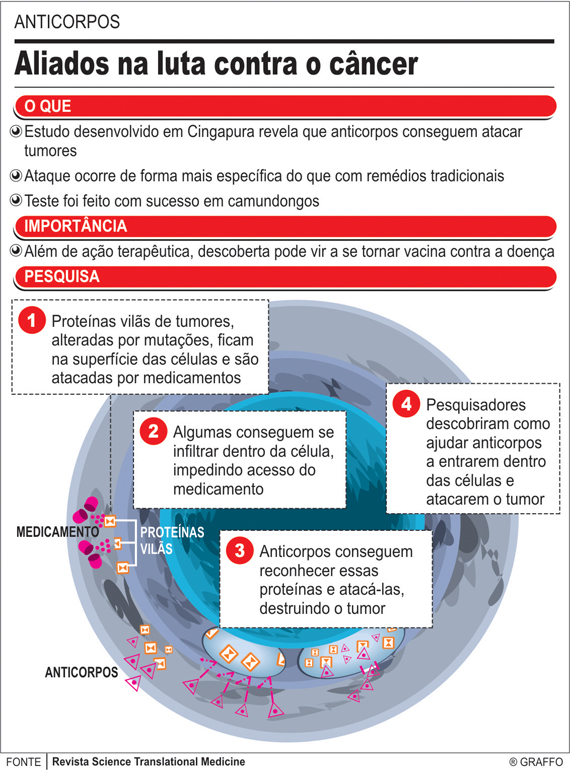 Cientistas do Instituto de Biologia Molecular e Celular da Agência de Ciência, Tecnologia e Pesquisa de Cingapura descobriram nos anticorpos verdadeiros aliados na luta contra o câncer. Conforme publicado na revista "Science Translational Medicine", o experimento já foi testado em camundongos e obteve sucesso.