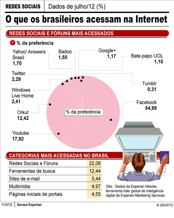 Em quarto lugar aparece a Ask.fm, com 2,52%, seguido do Twitter, com 1,91%. Ainda entre os top 10 sites da categoria Redes Sociais e Fóruns mais acessados no Brasil no período estão Yahoo! Answers Brasil (1,64%), Badoo (1,09%), Bate-papo UOL (0,89%), Google+ (0,85%), e Windows Live Home (0,70%).