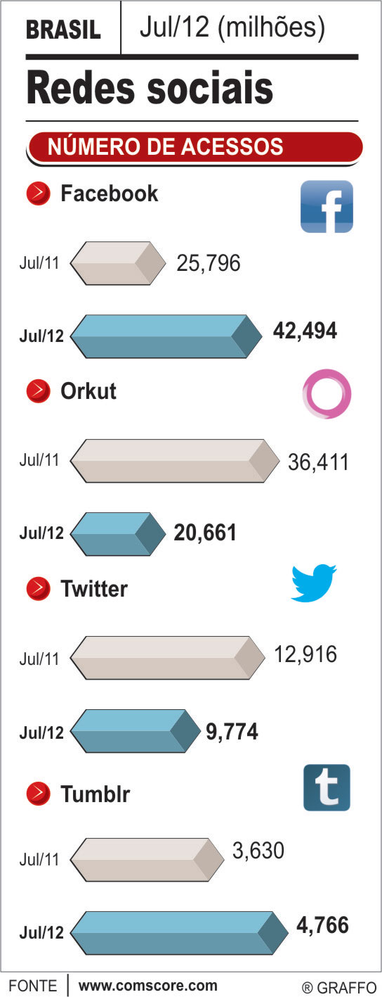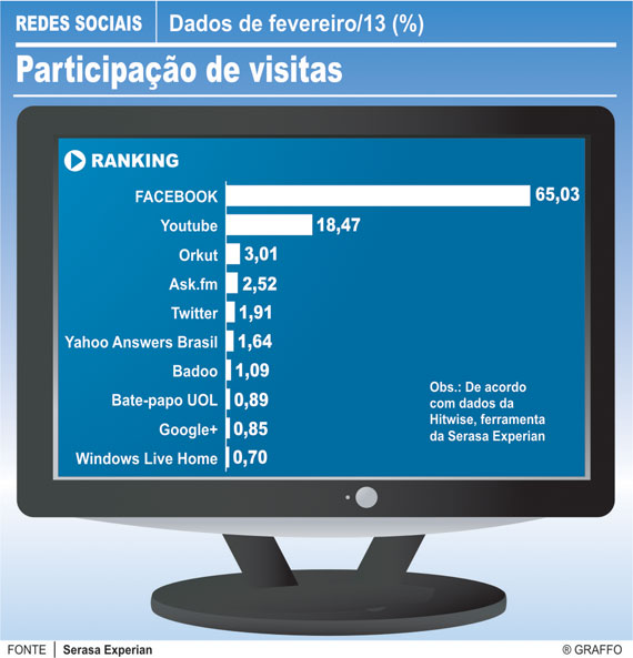 O Orkut segue em terceiro lugar, com 3,01% de participação de visitas em fevereiro de 2013, ante 28,17% no mesmo mês em 2012, quando ocupava o segundo lugar do ranking.
