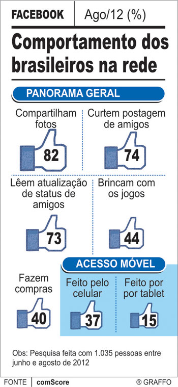 O Facebook manteve a liderança do ranking das redes sociais mais visitadas na Internet no Brasil, com 65,03% de participação de visitas em fevereiro de 2012, crescendo 0,52 ponto percentual em relação ao mês anterior e 27,47 pontos percentuais em relação ao mesmo período no ano passado. Em fevereiro de 2012, a rede social tinha 37,56% de participação de visitas, de acordo com dados da Hitwise, ferramenta de marketing digital da Serasa Experian.