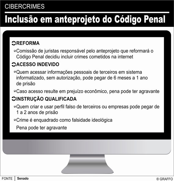 Ao mesmo tempo, conforme disse, a comissão readequou tipos penais já existentes, para incluir situações em que esses crimes são cometidos por meio do uso da internet. Nesse caso, ele citou o crime de falsa identidade, que passa a incluir um aumento de pena quando for cometido no ambiente cibernético.