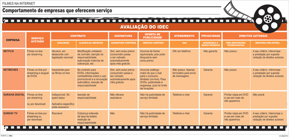 Apesar da facilidade para usar esses serviços – já que o consumidor não precisa sair de casa para assistir ao filme que deseja -, em janeiro, o Idec (Instituto de Defesa do Consumidor) avaliou os sites de quatro empresas que alugam e/ou vendem filmes digitais: Netflix, Netmovies, Saraiva Digital e Sunday TV (que durante a realização da pesquisa se chamava Terra TV Vídeo Store) e encontrou alguns problemas.
