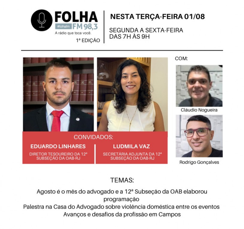 Para falar sobe a programação que conta com palestras, confraternização e homenagens, o Folha no Ar, da Folha FM 98,3, recebe nesta terça-feira (1), secretária adjunta e o diretor tesoureiro da 12ª Subseção da OAB-RJ, Ludmila Vaz e Eduardo Linhares.