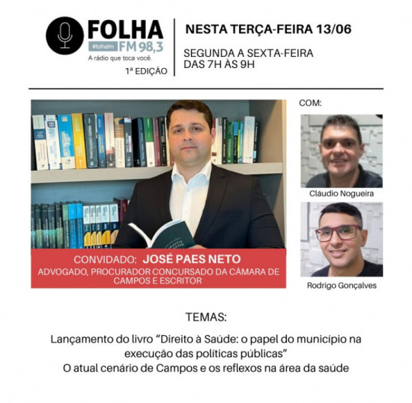 Como mostrado mais cedo no Blog Opiniões, do jornalista Aluysio Abreu Barbosa, tem o lançamento do livro “Direito à Saúde: o papel do município na execução das políticas públicas”, nesta quinta (15), às 19h, no Isecensa. E para falar sobre a publicação, o Folha no Ar, da Folha FM 98,3, desta terça-feira (13), recebe o autor da obra, José Paes Neto, advogado e procurador concursado da Câmara de Campos, além de ter sido procurador-geral no governo Rafael Diniz.