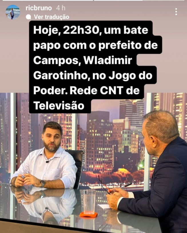 O prefeito de Campos, Wladimir Garotinho, é o entrevistado deste domingo, do jornalista Ricardo Bruno, no Jogo do Poder, às 22h30, na Rede CNT de Televisão. Na entrevista, Wladimir, como adiantado pelo site Agenda do Poder, vai confirmar sua ida ao PP. Algumas vezes falamos aqui no blog e na Folha da Manhã, que essa o destino mais certo do prefeito que tem ótima relação o presidente regional do Progressista, Dr. Luizinho, que é secretário estadual de Saúde, com quem Wladimir se reuniu na última quinta-feira (25).