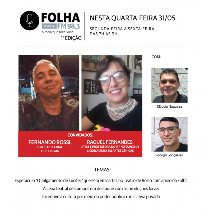 Para falar sobre o espetáculo, Fernando Rossi estará, ao vivo, a partir das 7h, na Folha FM 98,3, acompanhado da atriz Raquel Fernandes, que faz parte de um elenco de peso, e também é professora do IFF no curso de Licenciatura em Artes Cênicas. Além de falar sobre a nova temporada da peça, que já se encerrará neste fim de semana, os dois falarão sobre a cena teatral campista e como anda o incentivo à cultura no município, tanto por parte do poder público, quanto da iniciativa privada.