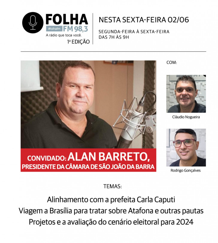 O presidente da Câmara de São João da Barra, Alan Barreto (Cidadania), é o entrevistado do Folha no Ar, desta sexta-feira (02). A partir das 7h, o vereador estará, ao vivo, na Folha FM 98,3, falando sobre o alinhamento feito, recentemente, com a prefeita Carla Caputi (sem partido). Eleito chefe do legislativo sanjoanenses em um movimento de ruptura com a base da então prefeita Carla Machado (PT), Alan vai falar sobre o que o levou a voltar a fazer parte da situação.