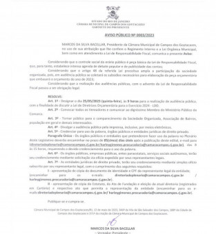 A Câmara Municipal de Campos dos Goytacazes vai realizar audiência pública no dia 25 de maio, quinta-feira, às 9h, para discutir a Lei de Diretrizes Orçamentária (LDO) para o exercício de 2024. As informações constam no Aviso Público nº 0003/2023.