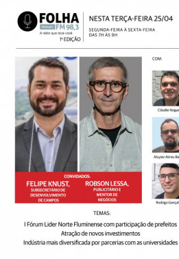 O Folha no Ar desta terça-feira (25) recebe o subsecretário de Desenvolvimento Econômico de Campos, Felipe Knust, e o publicitário e mentor de negócios, Robson Lessa. Ambos fazem parte do Lider Norte Fluminense, que é um grupo preparado pelo Sebrae e formado por lideranças da região para debater assuntos que visam ao crescimento integrado de municípios. Em busca disso, acontece nesta quarta-feira (26) o I Fórum Lider Norte Fluminense, a partir das 15h, no Centro de Convenções da Universidade Estadual do Norte Fluminense (Uenf).