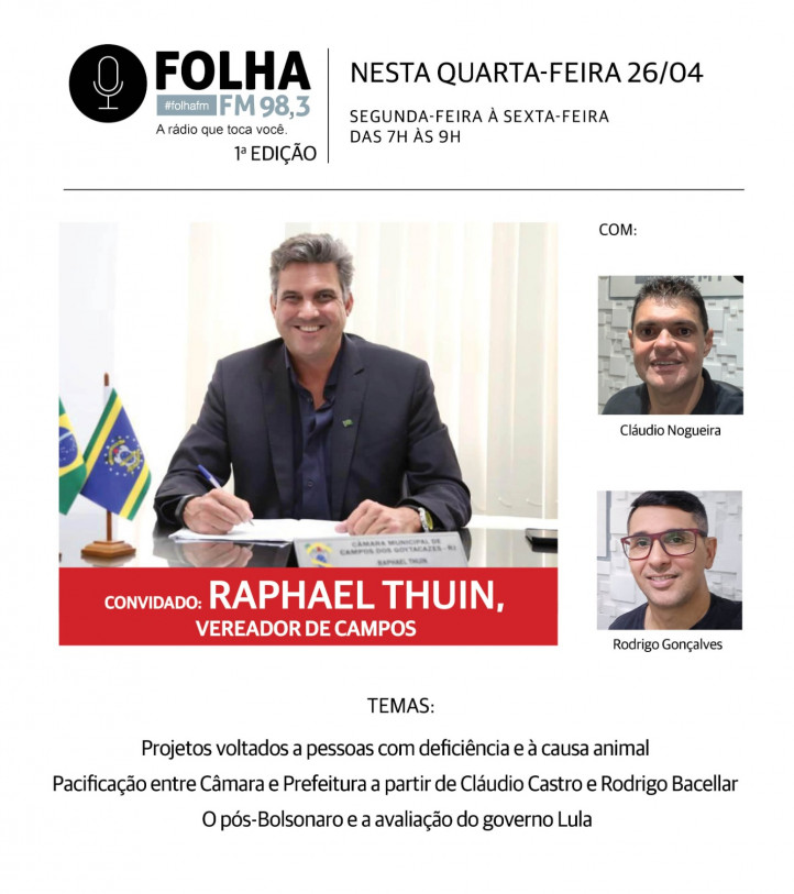 O vereador Raphael Thuin (PTB) é o entrevistado do Folha no Ar, da Folha FM 98.3, desta quarta-feira (26). Ele estará, ao vivo, a partir da 7h, falando do seu trabalho na Câmara de Vereadores com destaque a projetos voltados às pessoas com deficiência e à causa animal, como o projeto de lei, que prevê a Construção do 1º Hospital Municipal Veterinário para animais de pequeno porte e outro do “Cão de Apoio Emocional”, que dispõe sobre o direito da pessoa com deficiência mental, intelectual ou sensorial de ingressar e permanecer em ambientes públicos ou privados, assim como em transportes públicos e privados, acompanhado de cão de apoio. O vereador vai falar também sobre a luta para manter o Paraesporte.
