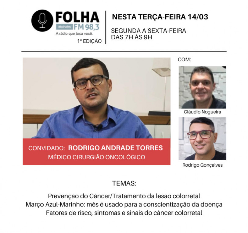 O Folha no Ar desta terça-feira (14) recebe o médico cirurgião oncológico Rodrigo Andrade Torres. Entre os assuntos abordados na Folha FM 98.3, a partir das 7h, estarão a prevenção do câncer e tratamento da lesão colorretal.