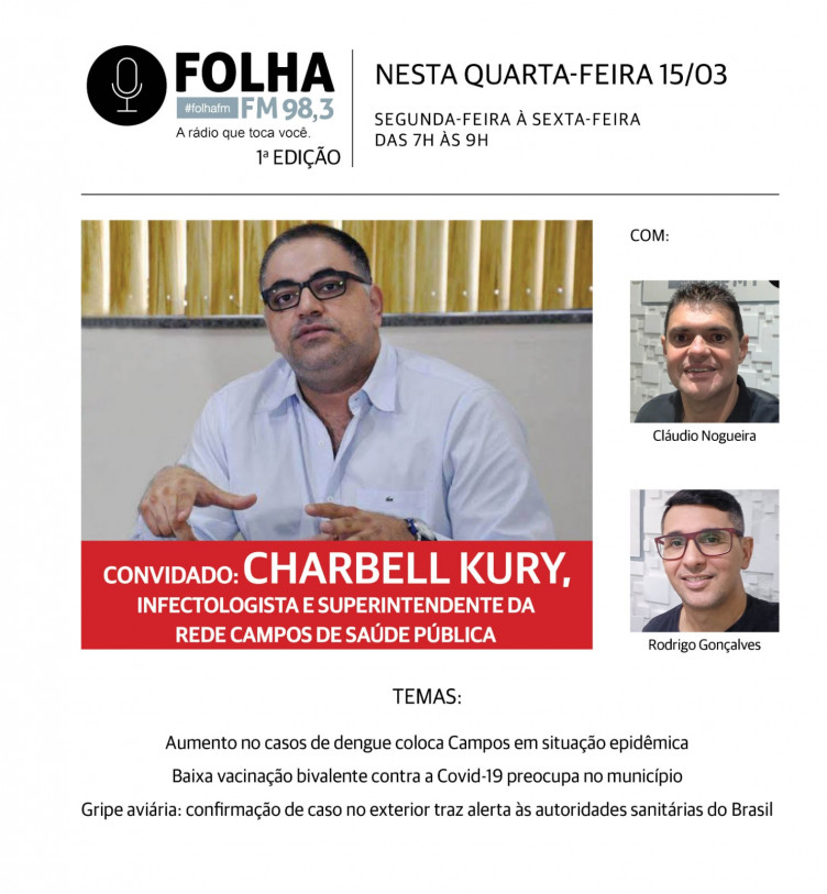 O Folha no Ar recebe, nesta quarta-feira (15), o superintendente da Rede Campos de Saúde Pública, o infectologista Charbell Kury. Um dos assuntos, e a maior preocupação no momento, é a dengue que contabiliza 701 casos confirmados, sendo um óbito no município, que se encontra em situação epidêmica para a doença. O próximo bairro a receber o grande mutirão de combate ao Aedes aegypti será o Jockey Club, na quinta-feira (17).