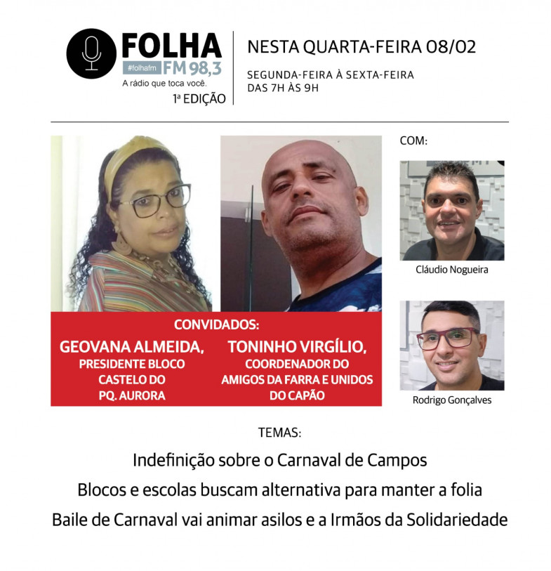 O Folha no Ar é, ao vivo, a partir das 7h, na Folha FM 98.3 é também pelo site e redes sociais da rádio.