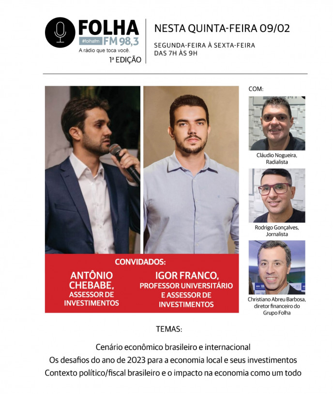 Os desafios e as perspectivas econômicas para 2023, com base no cenário brasileiro e internacional, serão temas do Folha no Ar desta quinta-feira (9), na Folha FM 98,3, a partir das 7h. O programa contará com a participação dos assessores de investimentos Antônio Chebabe e Igor Franco, este último também professor universitário, além de Christiano Abreu Barbosa, diretor financeiro do Grupo Folha. Aspectos globais em termos de fluxo, inflação, juros, entre outros assuntos estarão em pauta, assim como o impacto do panorama político/fiscal brasileiro na economia como um todo. O cenário local e seus investimentos também estarão em destaque. Todos esses temas vão te ajudar a entender como investir de forma segura.