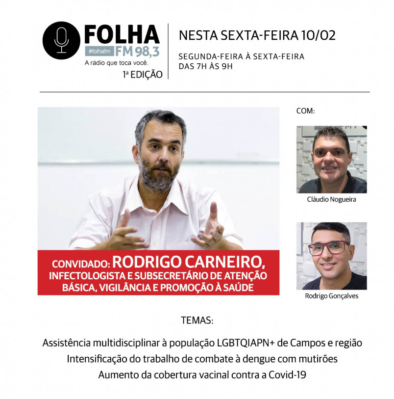 O subsecretário de Atenção Básica, Vigilância e Promoção à Saúde (Subpav), infectologista Rodrigo Carneiro, estará no Folha no Ar desta sexta-feira (09). Entre os assuntos está o início do funcionamento do ambulatório de assistência multidisciplinar à população LGBTQIAPN+ de Campos e região. Carneiro também vai falar sobre as ações de combate à dengue, que estão sendo intensificadas, inclusive com um mutirão em Travessão, onde um idoso morreu por complicações da doença. Com o médico, o programa via destacar, ainda, a cobertura vacinal no município, em especial contra a Covid-19.