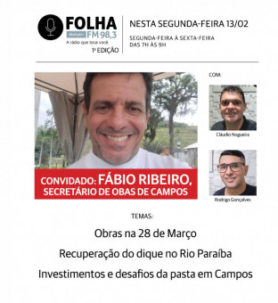Tem mais um Folha no Ar chegando nesta segunda-feira (13) e o entrevistado é o secretário de Obras e Infraestrutura de Campos, Fábio Ribeiro. O vereador licenciado assumiu a pasta há pouco mais de um mês e está acompanhando de perto duas intervenções importantes no município, a recuperação da avenida 28 de Março e a reconstrução do dique na XV de Novembro. Além de saber sobre o andamento destas duas obras, o programa vai falar sobre outras propostas e desafios da pasta.