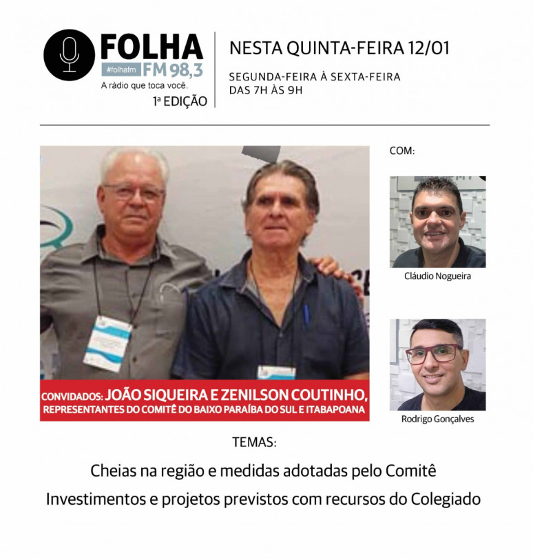 O Folha no Ar desta quinta-feira (12) recebe os membros da diretoria do Comitê de Bacia Hidrográfica Baixo Paraíba do Sul e Itabapoana, João Siqueira e Zenilson Coutinho. Em tempos de cheias na região, eles vão falar sobre as ações para tentar resolver este problema crônico, além de medidas paliativas, como a abertura da barra do Paraíba, em Atafona, litoral de São João da Barra, que aconteceu nesta quarta-feira (10), para tentar aumentar a vazão do rio e diminuir a pressão nos diques, alguns em risco.