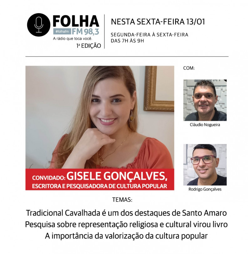 O Folha no Ar desta sexta-feira (13) vai receber a pesquisadora e escritora Gisele Gonçalves. Destaque por desenvolver trabalhos com temas vinculados ao patrimônio cultural e a cultura popular, ela é autora do Livro “A Cavalhada de Santo Amaro: Uma Cultura Viva na Baixada Campista”, da editora Essentia. Um registro que reconhece esta relevante manifestação popular, considerada patrimônio imaterial. A Cavalhada é uma das atrações deste domingo (15), dia do padroeiro da Baixada Campista, que já está em festa, inclusive com os preparativos para a tradicional caminhada de fé e devoção por quase 40 km.
