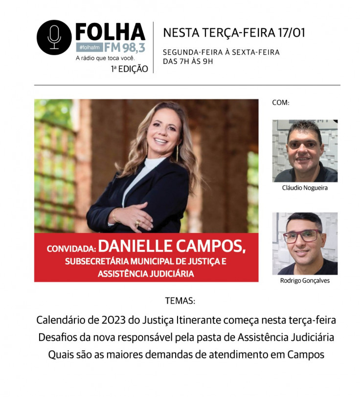 A subsecretária municipal de Justiça e Assistência Judiciária, Danielle Campos, uma das mudanças na equipe do prefeito Wladimir Garotinho em 2023, é a entrevistada do Folha no Ar desta terça-feira (17). Além de falar sobre os desafios do novo cargo, ela vai falar sobre o principal projeto da pasta que é o Justiça Itinerante, cujo o calendário de 2023 se inicia nesta terça, das 9h às 13h, na Praça São Gonçalo, no distrito de Goitacazes. O programa é desenvolvido em parceria com o Tribunal de Justiça do Estado do Rio de Janeiro (TJRJ).