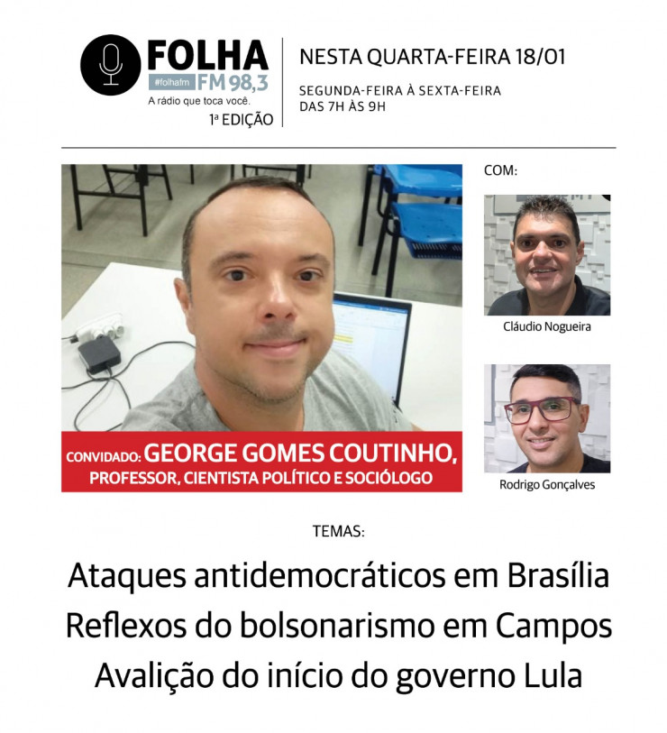 O Folha no Ar desta quarta-feira (18) vai abordar os ataques antidemocráticos ocorridos em Brasília, que refletiram também em Campos com a prisão de suspeitos de terem financiado o movimento apoiado por golpistas. O cientista político e sociólogo George Gomes Coutinho, professor da UFF, será o entrevistado, avaliando os reflexos dos atos bolsonaristas também no governo do presidente Luiz Inácio Lula da Silva, cuja equipe e primeiras ações adotadas também estarão em análise.
