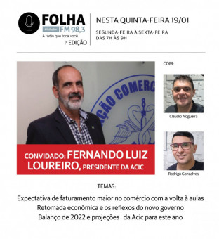 O empresário Fernando Luiz Loureiro, presidente da Associação Comercial e Industrial de Campos (Acic), é o entrevistado do Folha no Ar desta quinta-feira (19). Entre os assuntos está a expectativa da entidade para o aumento de 15% neste ano, em comparação com 2022, nas vendas nos segmentos de papelaria, uniforme e calçados. Além disso, o programa vai trazer um balanço das ações da Acic no último ano e falar de projeções para os setores do comércio e indústria em Campos e região.