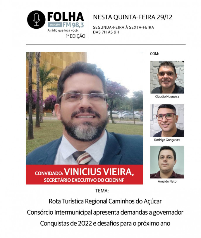 O secretário executivo do Consórcio Público Intermunicipal de Desenvolvimento do Norte e Noroeste Fluminense (Cidennf), Vinicius Vieira, estará no Folha no Ar, da Folha FM 98,3, desta quinta-feira (29), a partir das 7h. Entres os assuntos, estará a Rota Regional Caminhos do Açúcar e o último encontro que prefeitos tiveram com o governador do Estado do Rio de Janeiro, Cláudio Castro, com o objetivo de dialogar sobre os desafios regionais, como a mudança de regras do Imposto sobre Circulação de Mercadorias e Serviços (ICMS) dos Royalties.