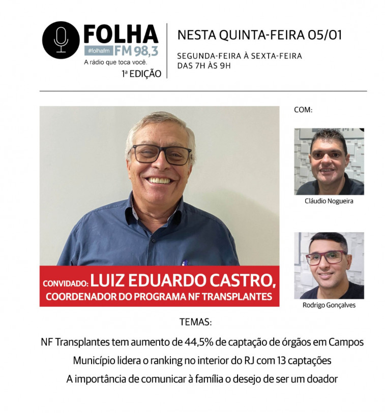 O coordenador do Programa NF Transplantes, o médico Luiz Eduardo Castro, estará no Folha no Ar, da Folha FM 98,3, desta quinta-feira (05), a partir das 7h. Campos contabilizou em 2022 um total de 13 doações de múltiplos órgãos, superando os números do ano anterior (2021), quando foram registradas 9 doações, 44,5% a mais, se comparado a 2021. O município lidera o ranking de captações se comparado com outras cidades do interior do Estado. Araruama vem em segundo lugar com 11 captações.