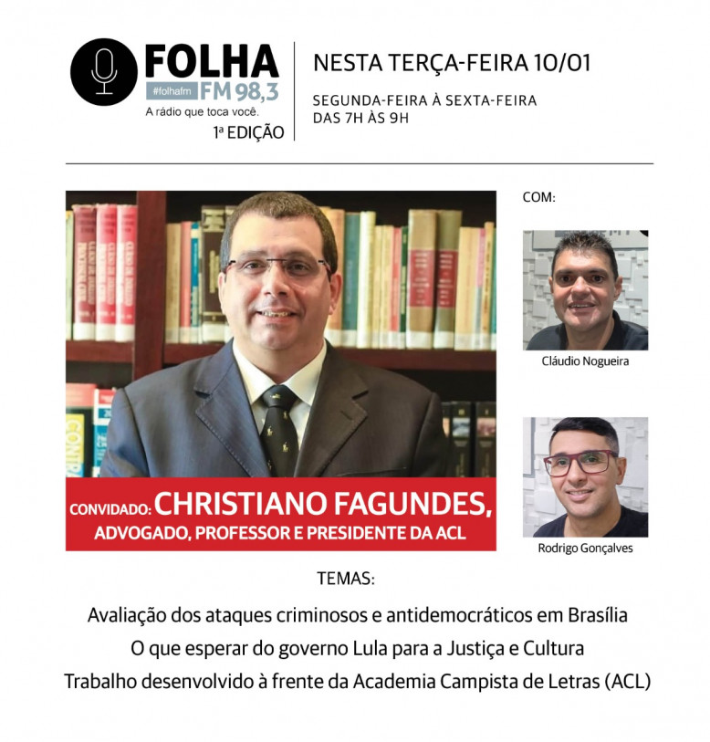 O Folha no Ar desta terça-feira (10) recebe o advogado, professor, escritor e presidente Academia Campista de Letras (ACL), Christiano Fagundes. Na entrevista, ao vivo, na Folha FM 98,3, a partir das 7h, o advogado vai fazer uma avaliação sobre os ataques criminosos e antidemocráticos aos Três Poderes, em Brasília. Ele vai falar também sobre o que espera do governo Lula para a Cultura e outras áreas.