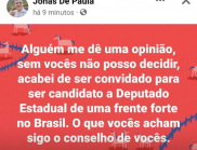 Em suas redes sociais, o blogueiro e comunicador Jonas de Paula, ligado à Itaperuna e Região Noroeste-RJ, lançou uma autoenquete hoje, pedindo ajuda aos seguidores na decisão por uma possível pré-candidatura a deputado estadual: