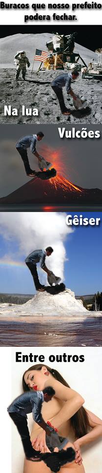 Esta não foi a primeira saia justa que o prefeito enfrentou nos últimos dias nas redes sociais. Recentemente ele teve a infeliz ideia de postar fotos tapando buracos em uma rua de Atafona. Bastou para a chacota se espalhar pela timeline dos sanjoanenses. Alguns comentários passaram do tom, mas não foram apagados. Uma fonte do governo diz que a decisão é deixar lá por dois motivos: o primeiro é porque a intenção é processar os debochados; a segunda é para queimar o filme da oposição, a quem o prefeito e seus mais chegados assessores atribuem as críticas. Um internauta mais criativo, que assina como Zé Zeca Atafona, chegou a bolar uma arte sugerindo uma série de buracos que poderiam ser tapados pelo prefeito.