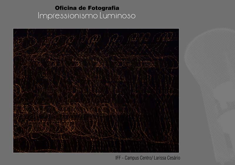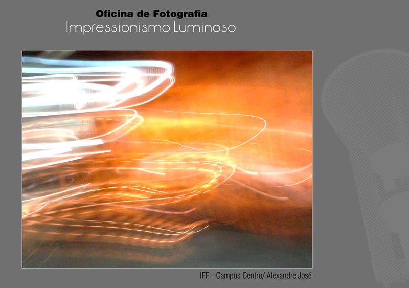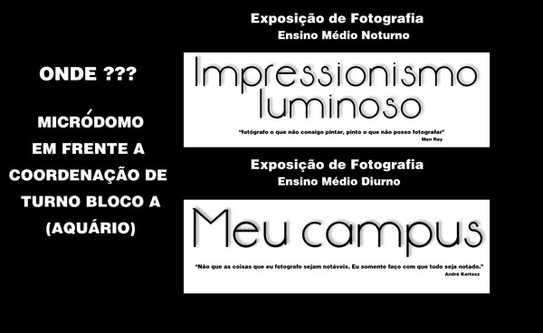 Ao entrar nesta sala você verá duas exposições fotográficas produzidas pelos alunos de artes /fotografia , um apanhado, são fotos figurativas com o título de “Meu campus” produzida pelos alunos do ensino médio diurno e a outra mostra, são fotografias abstratas que se chama “Impressionismo Luminoso” fotografadas pelos alunos do ensino médio noturno, todas as fotos foram captadas dentro do campus e também em seu entorno, mas sempre mantendo uma conexão com o Instituto. Foi trabalhado nesta exposição tanto nas fotos dos alunos do diurno quanto noturno, a busca pelo olhar diferente, ancorado nas técnicas e nos elementos da linguagem fotográfica , assuntos que foram debatidos de forma teórica e prática durante o primeiro semestre, o resultado é impressionante, você irá comprovar as inúmeras possibilidades de ver, mesmo diante da saturação imagética do cotidiano, pois é, esse é o grande barato do ato de fotografar, que é desafiar a antiga forma de ver, seja bem vindo!