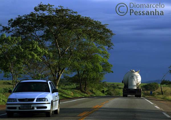 Foto feita em uma ato de irresponsabilidade enorme , quando viajava pela manhã de ontem, ainda na estrada avistei a cena não resisti e clickei, a foto abaixo não é uma brilhantismo de composição, melhor dizer que está bem longe da pretensão de ser, rsrsrrs, o que me impulsionou foi a relação de contraste que tinha a minha frente , era uma iluminação lateral, que o sol fazia no sentido longitudinal da estrada, contrastando com uma nuvem densa que estava parada acima da estrada, e que reproduzia a mesma situação no horizonte, para completar dois carros brancos que vinha em direção oposta, ajudando mais ainda a intensificar o contraste, bem pra que isso tudo, rsrrss ?