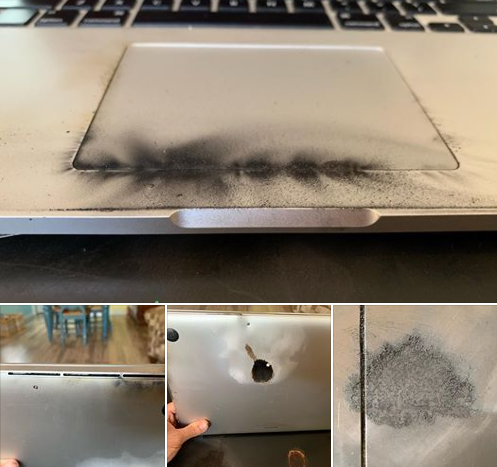Gagne publicou fotos do MacBook queimado em um post no Facebook. No relato, ele conta que a máquina não estava ligada ao cabo de carregamento quando começou a queimar e que se encontrava no Modo de Espera e com a tela fechada.