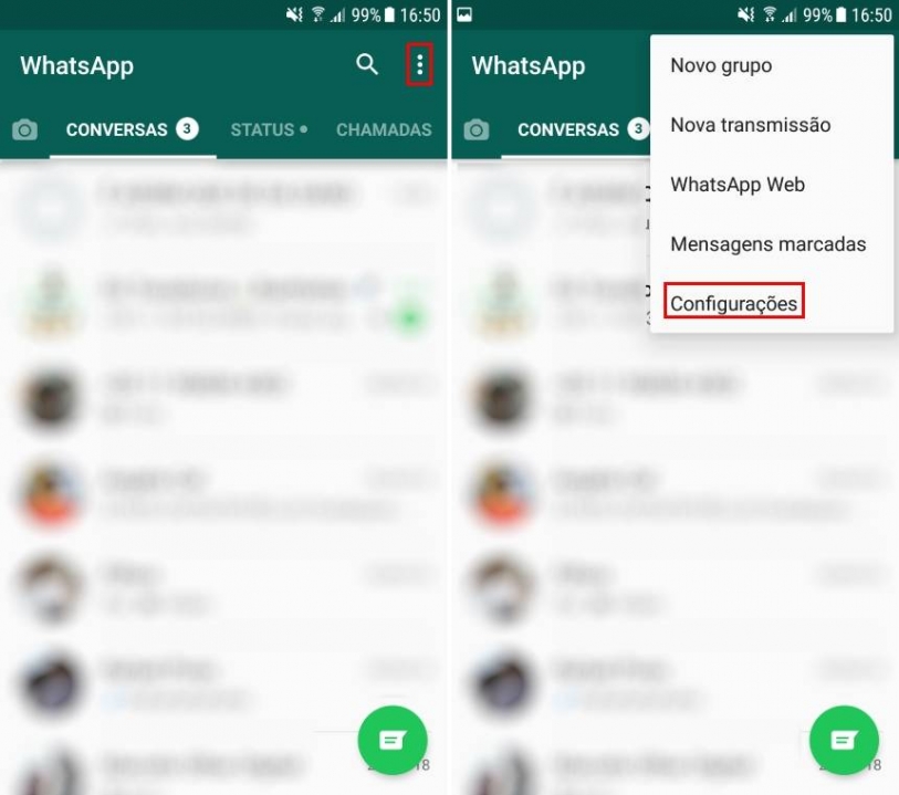 Na tela inicial do WhatsApp, dê um toque no ícone representado por “três pontos” e vá em “Configurações”;