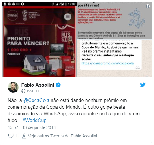 Um novo golpe espalhado pelo WhatsApp usa a Copa do Mundo para tentar enganar usuários. Com um suposto "prêmio da Coca-Cola", a mensagem induz a vítima a clicar em um link que pode causar transtornos diversos ao usuário.