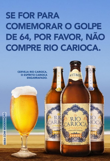 Não, não é a cantilena mal sucedida dos petistas contra o impeachment de Dilma. É a Cerveja Rio Carioca se manifestando, em anúncio de oportunidade publicado em suas redes sociais e no jornal O Dia, contra a bizarra ideia de comemorar o Golpe de 64 dada pelo presidente Bolsonaro, que recuou depois.