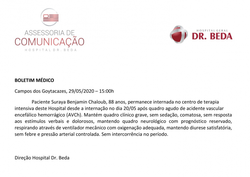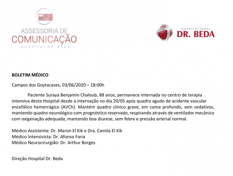 O Hospital Dr. Beda divulgou, no início da tarde, através de sua assessoria de imprensa, um boletim médico sobre Irmã Suraya Chaloub. Seu estado de saúde permanece grave, com ela se encontrando clinicamente estável desde que fez uma cirurgia após ter um AVE (Acidente Vascular Encefálico) hemorrágico na quarta-feira passada.