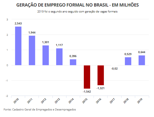 O Brasil criou 644 mil empregos de carteira assinada em 2019, o melhor resultado desde 2013. Após a maior recessão econômica de sua história, no governo Dilma Rousseff, a economia segue seu lento caminho de retomada na geração de empregos.