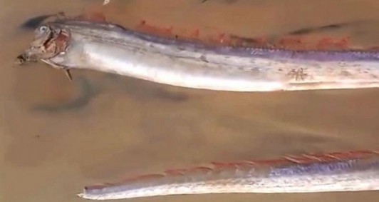 Um peixe-remo, também conhecido com "peixe do fim do mundo", foi encontrado morto na praia de Atafona, em São João da Barra, nesta sexta-feira (6). Por ser um peixe que vive nas profundezas do oceano, geralmente, encontrado a até 1.000 metros de profundidade, esse peixe raramente é visto nas superfícies. Porém, quando isso ocorre, acaba por despertar medo na população, pois, segundo as lendas, ele “prevê terremotos”. Acredita-se que ele tenha chegado até a praia por conta dos navios de outros países que chegam ao Porto do Açu.