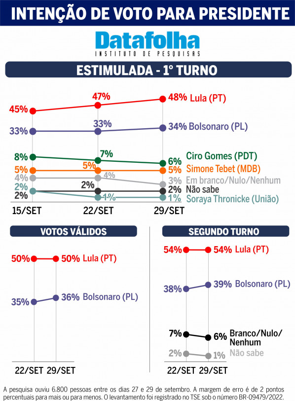 A pesquisa ouviu 6.800 pessoas entre os dias 27 e 29 de setembro. A margem de erro é de 2 pontos percentuais para mais ou para menos. O levantamento foi registrado no TSE sob o número BR-09479/2022.